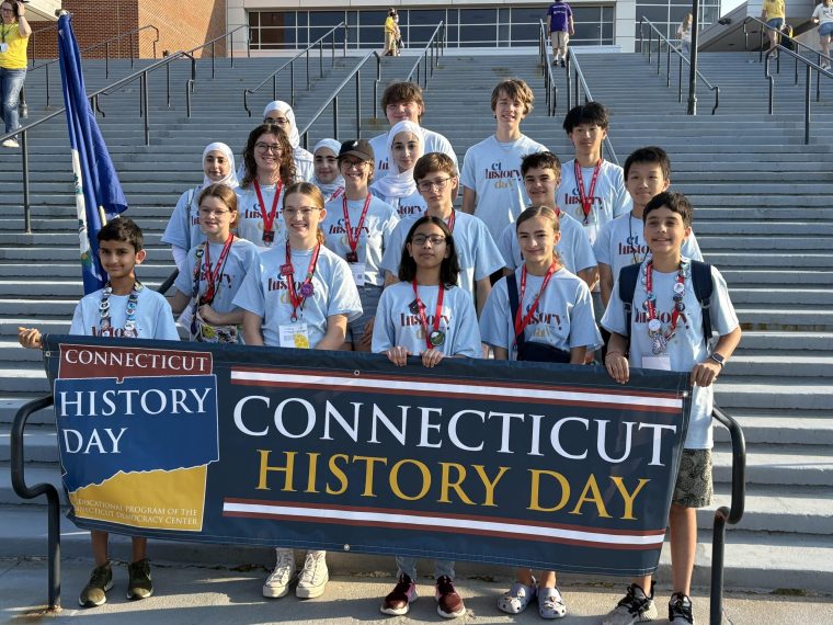 (Hartford, CT) June 12, 2025 — Sixty students in grades 6-12 represented Connecticut at the prestigious 2025 National History Day® Contest at the University of Maryland this past week. Twenty of them will return home with awards and special prizes. The Connecticut History Day team joined over 2,800 students from the U.S. and overseas to compete in the 51st National History Day® Contest this week. Middle and high school students earned a spot on the Connecticut team by finishing in the top two at the Connecticut History Day State Contest after winning regional contests earlier in the spring. Connecticut History Day, an affiliate of National History Day®, is a Connecticut Democracy Center program in residence at Connecticut’s Old State House. In addition to the recognition of Connecticut students, Kristin Behn, a school social studies teacher at Worthington Hooker School in New Haven was among the top five candidates for the 2025 National History Day Teacher of the Year award.